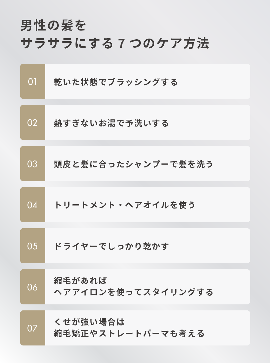 男性が髪をサラサラにする具体的な方法は、以下の7つです。