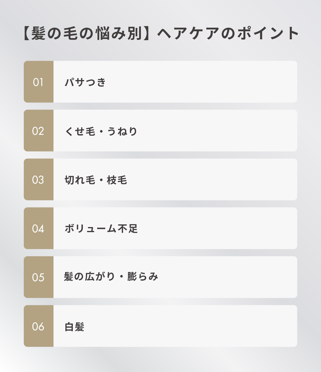 髪の毛のお悩み別にヘアケアのポイントを解説します。