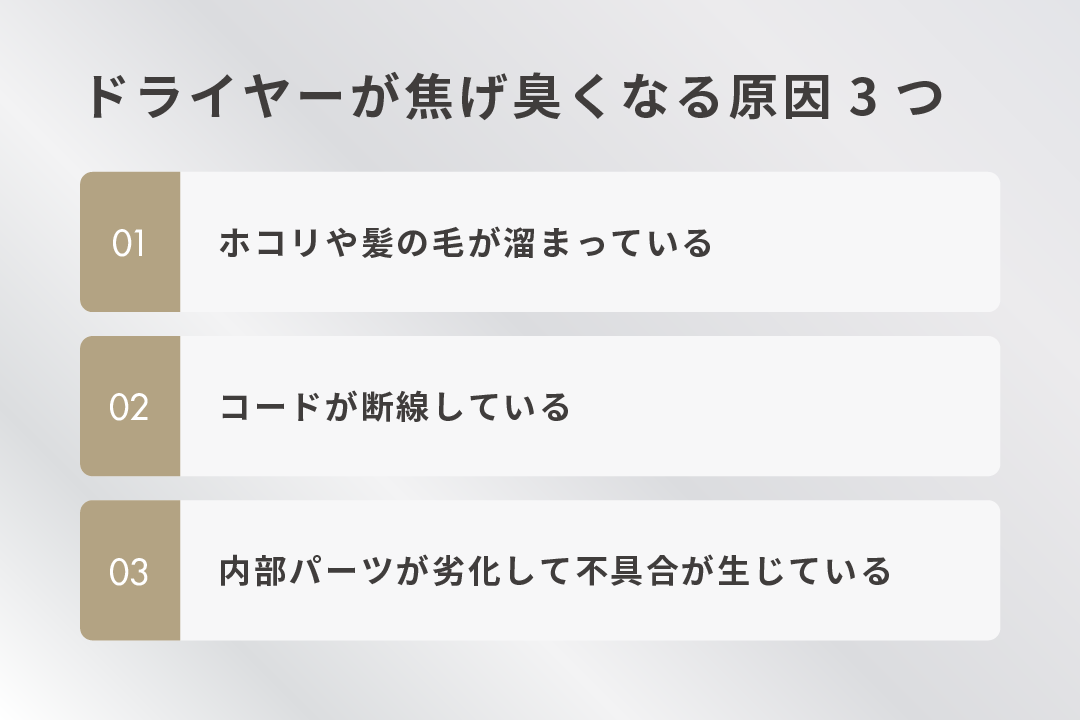 ドライヤーが焦げ臭くなる原因として、主に以下の3つが考えられます。