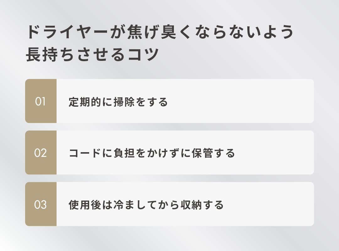 ドライヤーをなるべく長持ちさせるためのコツは、主に以下の3つです。