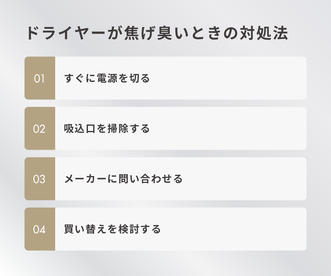 ドライヤーが焦げ臭いときの対処法は、主に以下の4つです。