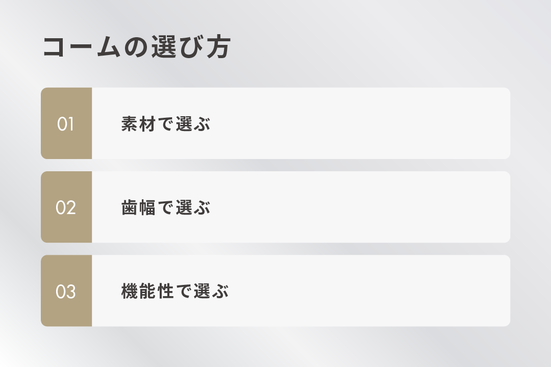 コームを選ぶときにチェックしたいポイントは、主に以下の3つです。