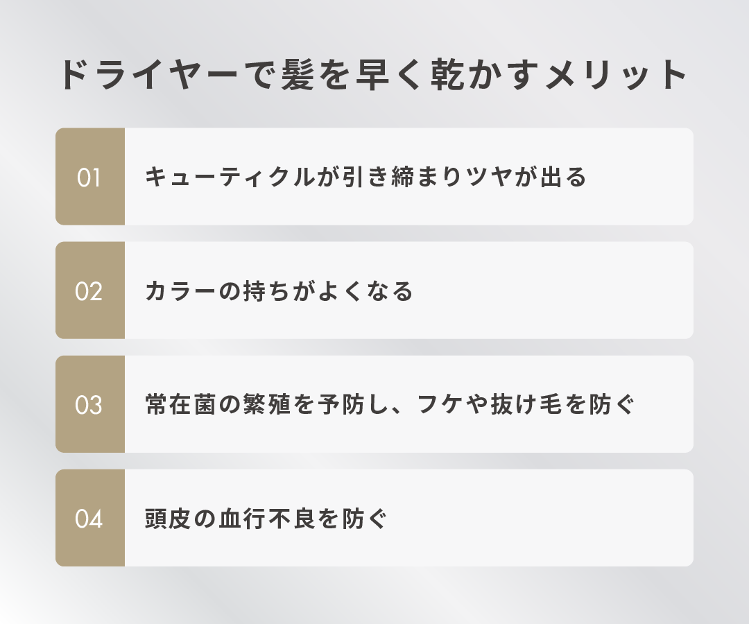 ドライヤーで髪を早く乾かすメリットは以下のとおりです。