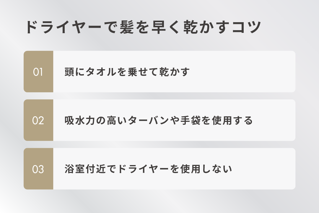 ドライヤーで髪を早く乾かす3つのコツは以下のとおりです。
