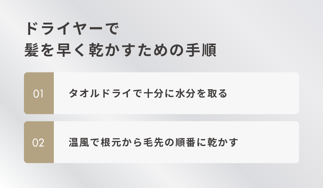 ドライヤーで髪を早く乾かす手順は以下の2ステップです。