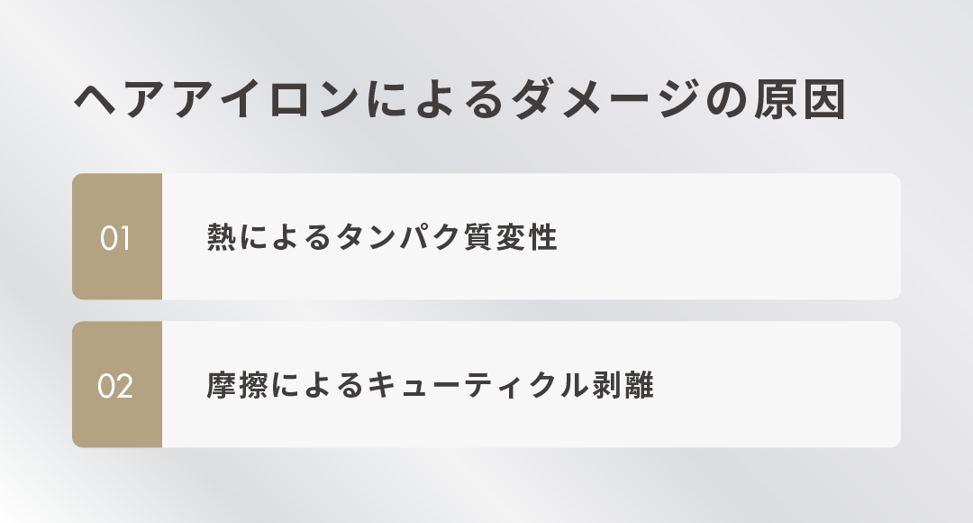 ヘアアイロンによるダメージは、熱によるタンパク質変性と摩擦によるキューティクル剥離の2つに分けられます。