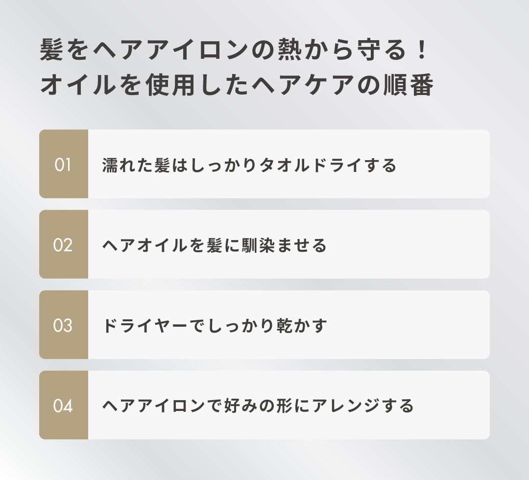 なお、このタイミングで使用できるのはヘアアイロン用のヘアオイルです。通常のヘアオイルだと、アイロン前の使用は髪を傷める原因になる可能性もあるので、メーカーの指示や説明書に記載のタイミングに従いましょう。
