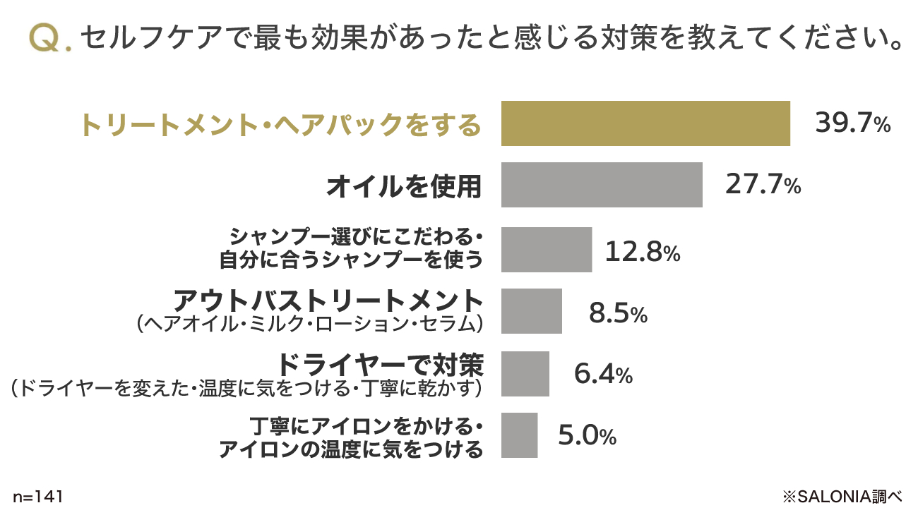 最も効果の高かったセルフケアについて質問したところ、トリートメントやヘアパックといったシャンプー後のケアが4割近くと最多でした。