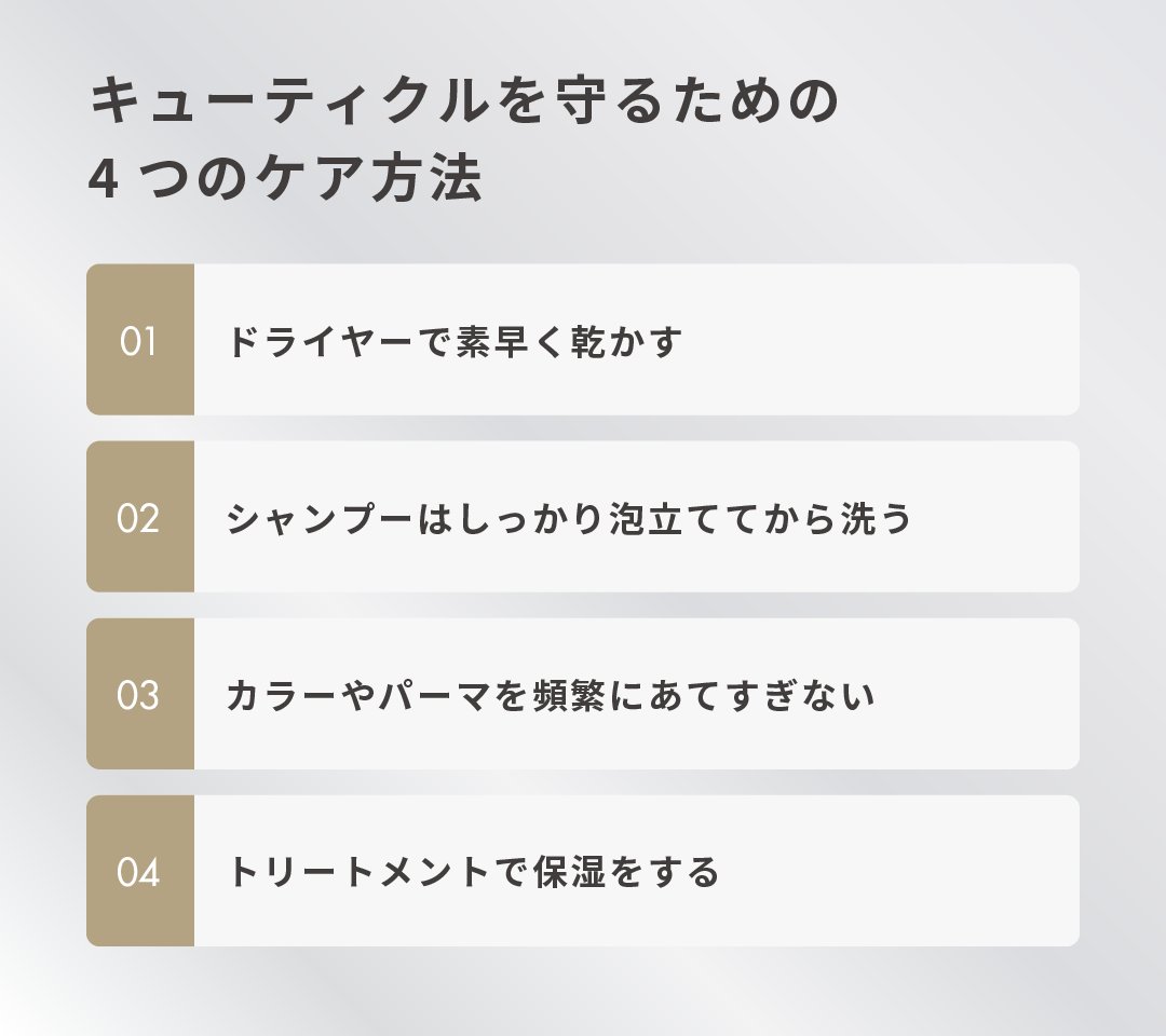 キューティクルを守るためのケア方法は以下の4つです。