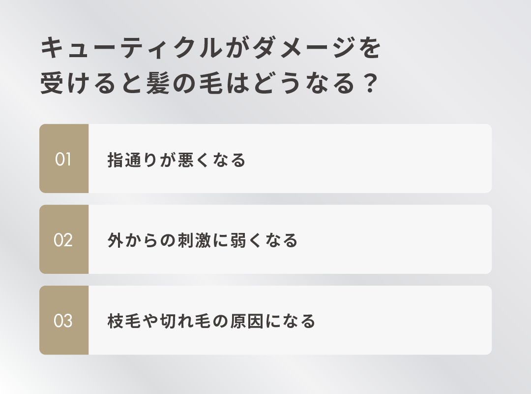 キューティクルがダメージを受けることで起きる髪への影響は、以下の3つです。