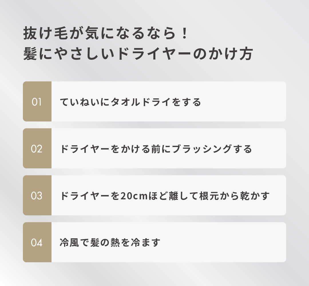 抜け毛が気になっているなら、ドライヤーの際に髪や頭皮にダメージを与えないように素早く乾かすのが重要です。