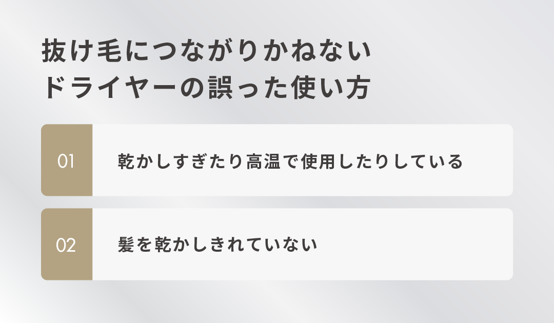 ドライヤーは抜け毛の直接的な原因にならないものの、間違った使い方で髪や頭皮にダメージを与えると抜け毛につながることがあります。