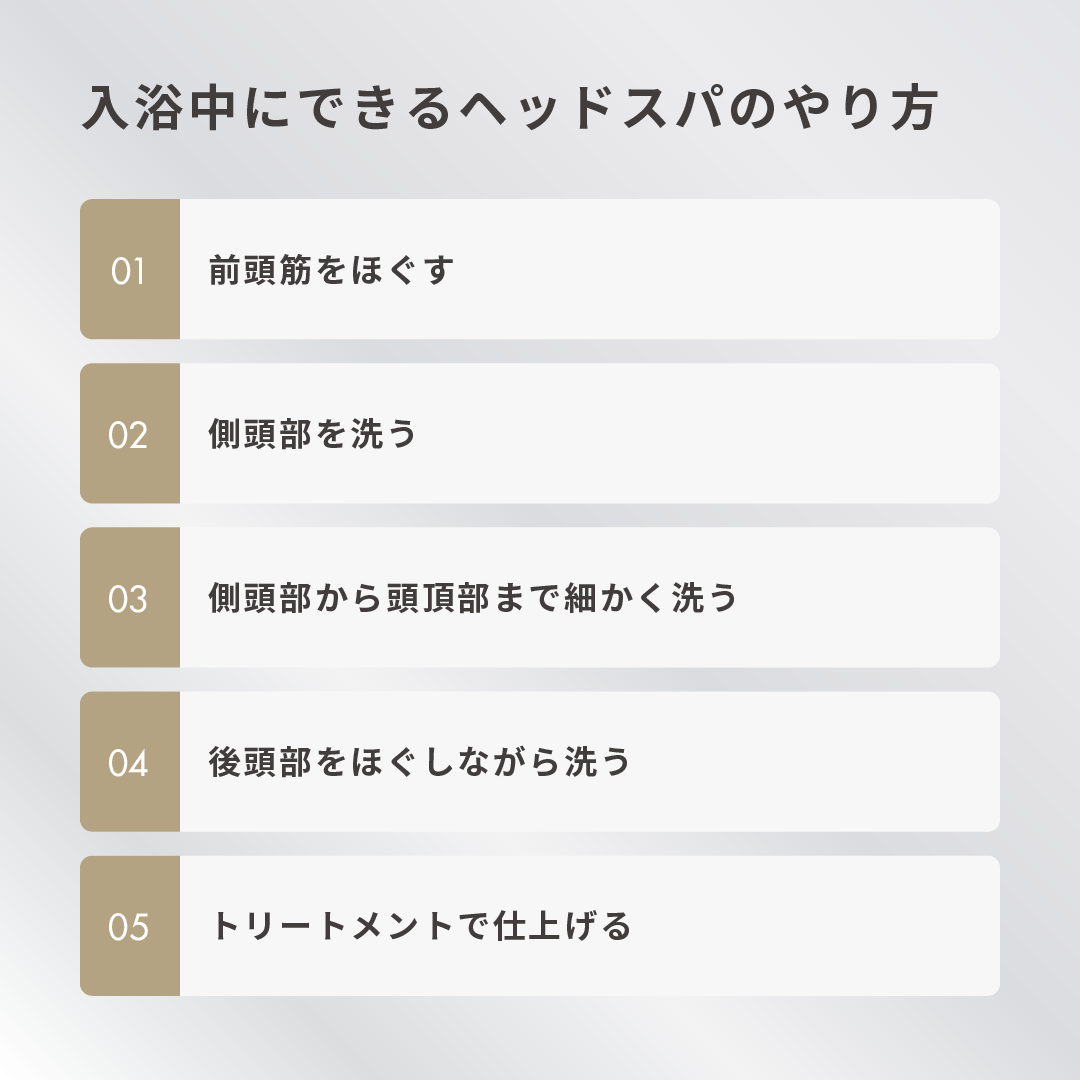 入浴中にできるヘッドスパのやり方は、以下の5ステップです。