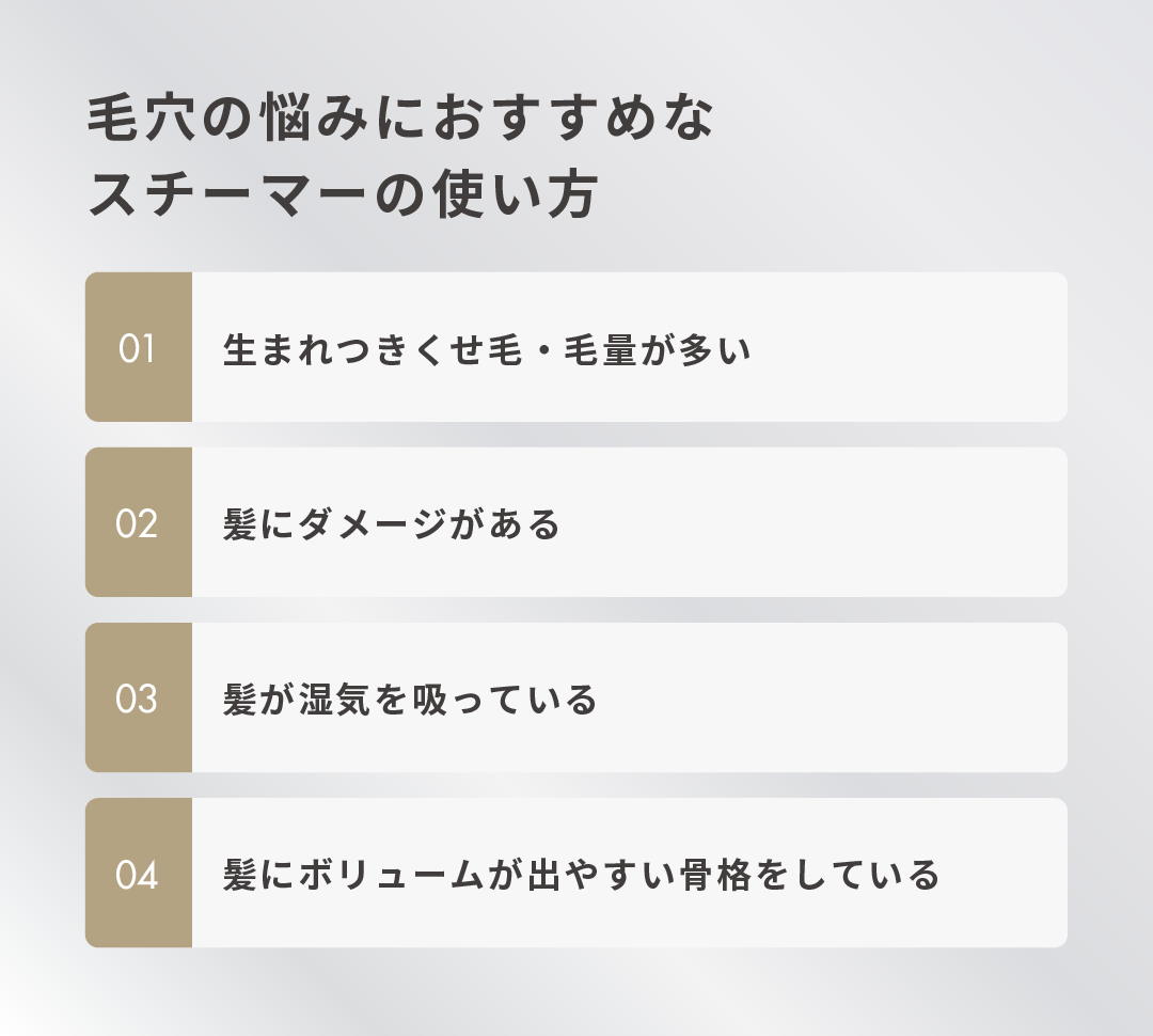 スチーマーから出る蒸気で肌にうるおいを与えると、毛穴のケアにつながります。